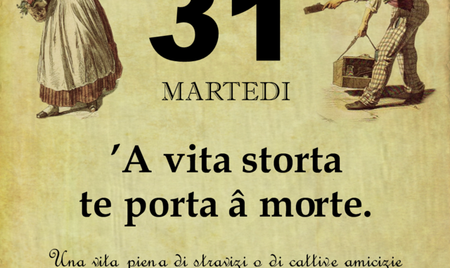 ‘O PRUVERBIO D’ ‘O JUORNO. Martedì 31 ottobre 2017 31/10/2017 binews.it ATTUALITA', Il Proverbio del Giorno 0 A vita storta te porta â morte. Una vita piena di stravizi o di cattive amicizie porta ben presto alla rovina.