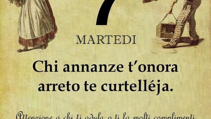 ‘O PRUVERBIO D’ ‘O JUORNO. Martedì 7 ottobre 2017 07/11/2017 binews.it ATTUALITA', Il Proverbio del Giorno 0 Chi annanze t’onora arreto te curtelléja. Attenzione a chi ti adula o ti fa molti complimenti perchè in genere sparla poi alle tue spalle.