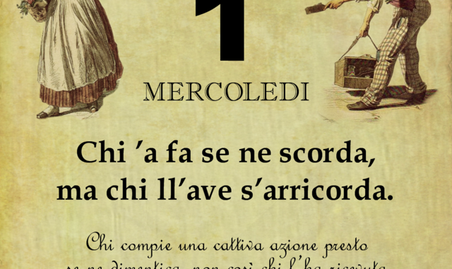 ‘O PRUVERBIO D’ ‘O JUORNO. Mercoledì 1 novembre 2017 01/11/2017 binews.it ATTUALITA', Il Proverbio del Giorno 0 Chi ’a fa se ne scorda, ma chi ll’ave s’arricorda. Chi compie una cattiva azione presto se ne dimentica, non così chi l’ha ricevuta o ne ha subito le conseguenze.