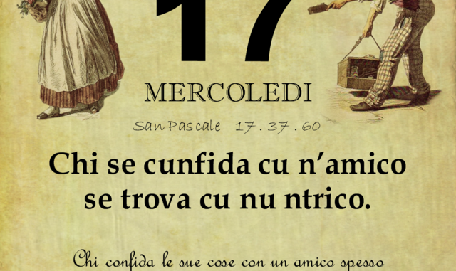 – ‘O PRUVERBIO D’ ‘O JUORNO – Mercoledì 17 maggio 2017 17/05/2017 binews.it ATTUALITA', CULTURA e MANIFESTAZIONI 0 “Chi se cunfida cu n’amico se trova cu nu ntrico”. Chi confida le sue cose con un amico spesso si trova in un pasticcio a causa di pettegolezzi, cattivi consigli, etc.…