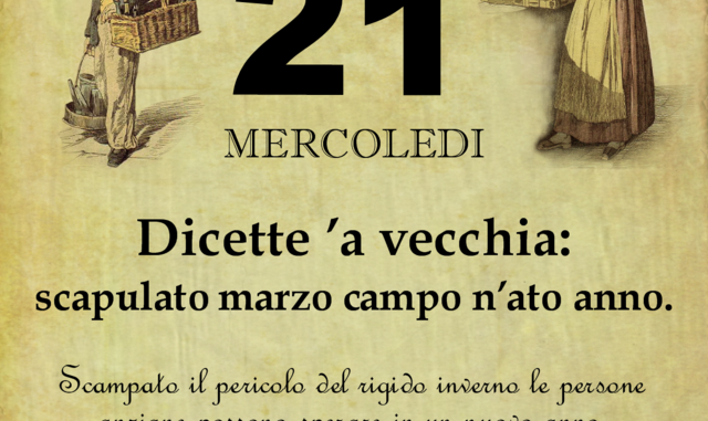 ‘O PRUVERBIO D’ ‘O JUORNO. Mercoledì 21 marzo 2018 21/03/2018 binews.it ATTUALITA', Il Proverbio del Giorno 0 Dicette ’a vecchia: scapulato marzo campo n’ato anno. Scampato il pericolo del rigido inverno le persone anziane possono sperare in un nuovo anno.