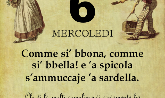 ‘O PRUVERBIO D’ ‘O JUORNO. Mercoledì 6 settembre 2017 06/09/2017 binews.it ATTUALITA', Il Proverbio del Giorno 0 Comme si’ bbona, comme si’ bbella! e ’a spicola s’ammuccaje ’a sardella. Chi ti fa molti complimenti certamente ha intenzione di fregarti in qualche modo.