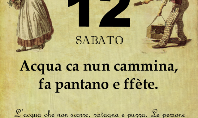 ‘O PRUVERBIO D’ ‘O JUORNO. Sabato 12 agosto 2017 12/08/2017 binews.it ATTUALITA', Il Proverbio del Giorno 0 Acqua ca nun cammina, fa pantano e ffète. L’acqua che non scorre, ristagna e puzza. Le persone taciturne, sono quelle che più tramano nell’ombra.