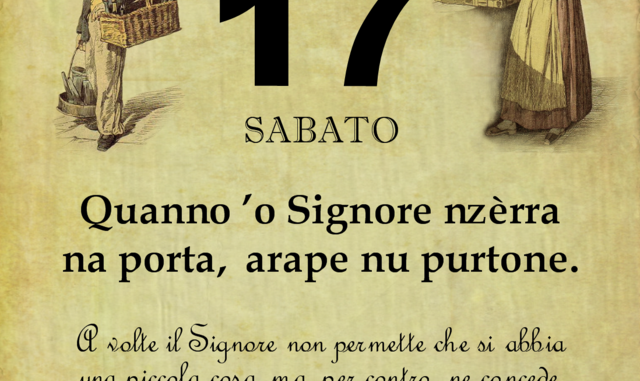 ‘O PRUVERBIO D’ ‘O JUORNO. Sabato 17 marzo 2018 17/03/2018 binews.it ATTUALITA', Il Proverbio del Giorno 0 Quanno ’o Signore nzèrra na porta, arape nu purtone. A volte il Signore non permette che si abbia una piccola cosa, ma, per contro, ne concede poi maggiori e più importanti benefici.