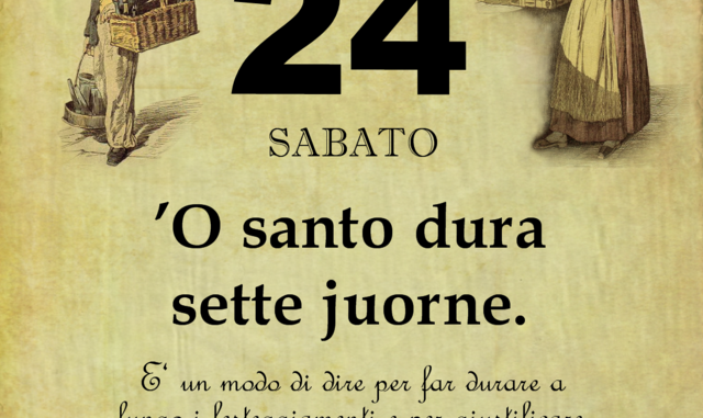 ‘O PRUVERBIO D’ ‘O JUORNO. Sabato 24 marzo 2018 24/03/2018 binews.it ATTUALITA', EVIDENZA, Il Proverbio del Giorno 0 ’O santo dura sette juorne. E‘ un modo di dire per far durare a lungo i festeggiamenti e per giustificare gli auguri fatti in ritardo.