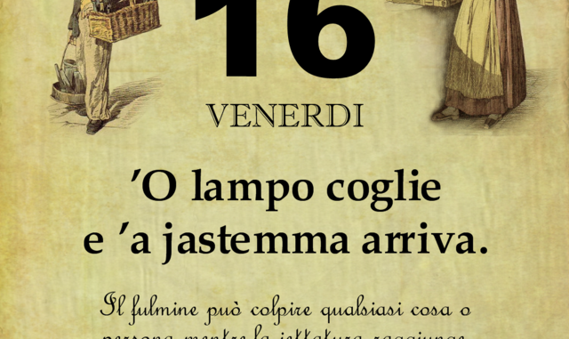 ‘O PRUVERBIO D’ ‘O JUORNO. Venerdì 16 febbraio 2018 16/02/2018 binews.it ATTUALITA', EVIDENZA, Il Proverbio del Giorno 0 ’O lampo coglie e ’a jastemma arriva. Il fulmine può colpire qualsiasi cosa o persona mentre la jettatura raggiunge sempre il bersaglio predestinato.