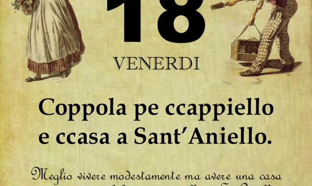 ‘O PRUVERBIO D’ ‘O JUORNO. Venerdì 18 agosto 2017 18/08/2017 binews.it ATTUALITA', Il Proverbio del Giorno 0 Coppola pe ccappiello e ccasa a Sant’Aniello. Meglio vivere modestamente ma avere una casa in una zona salubre come quella di S. Aniello.