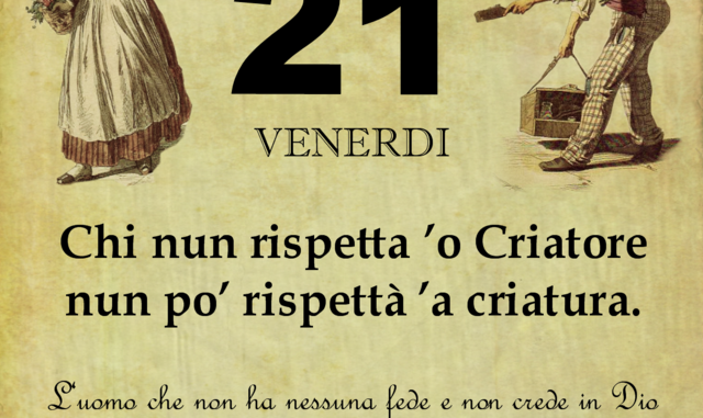 O PRUVERBIO D’ ‘O JUORNO. Venerdì 21 luglio 2017 21/07/2017 binews.it ATTUALITA', Il Proverbio del Giorno 0 Chi nun rispetta ’o Criatore nun po’ rispettà ’a criatura. L‘uomo che non ha nessuna fede e non crede in Dio agisce male anche con i suoi simili.
