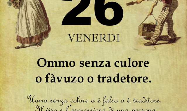 ‘O PRUVERBIO D’ ‘O JUORNO – Venerdì 26 maggio 2017 26/05/2017 binews.it ATTUALITA', Il Proverbio del Giorno 0 “Ommo senza culore o fàvuzo o tradetore”. Uomo senza colore o è falso o è traditore. Il viso e l’espressione di una persona sono lo specchio dei suoi sentimenti.