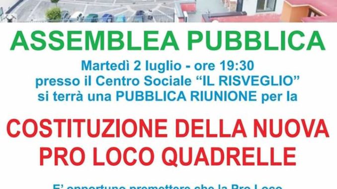 QUADRELLE (AV). Ci si riunisce per la nascita della nuova Pro Loco 26/06/2019 binews.it ATTUALITA', QUADRELLE 0 Martedì 2 luglio presso il Centro Sociale “Il Risveglio” si terrà una pubblica riunione per la costituzione della nuova Pro Loco Quadrelle.