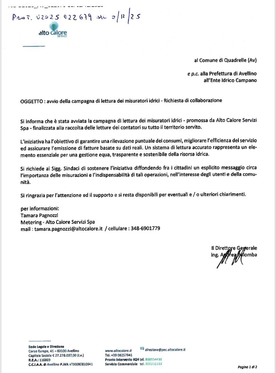 L’Alto Calore Servizi Spa ha annunciato l’avvio della nuova campagna di lettura dei misuratori idrici su tutto il territorio servito, coinvolgendo anche il Comune di Quadrelle. L’iniziativa, comunicata ufficialmente agli enti locali e alla Prefettura di Avellino, ha l’obiettivo di raccogliere le letture dei contatori per garantire una gestione efficiente e trasparente delle risorse idriche.