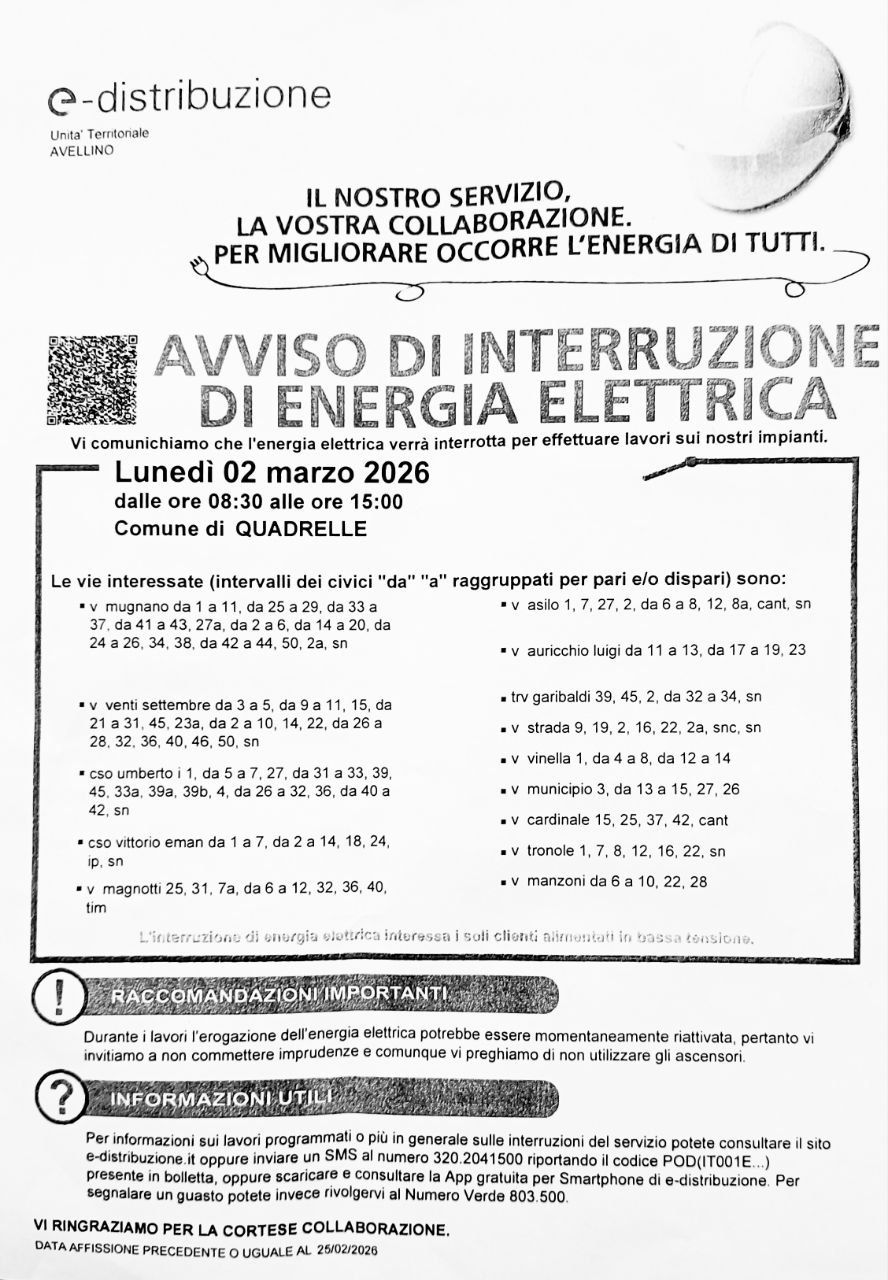 Il Comune informa la cittadinanza che, per consentire interventi di manutenzione e potenziamento della rete elettrica, lunedì 2 marzo 2026 è prevista un’interruzione programmata dell’energia nel territorio di Quadrelle.