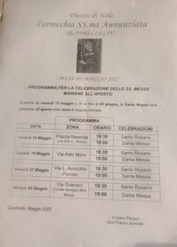 A Quadrelle per il mese di maggio, tradizionalmente dedicato alla Madonna, è stato stilato un calendario per rendere edotta la popolazione che saranno celebrate delle messe all’aperto con cadenza settimanale. Questa sera la Santa Messa è stata celebrata in via Aldo Moro, tantissimi i fedeli presenti che hanno recitato il Santo Rosario e poi hanno partecipato alla Celebrazione Eucaristica.Quadrelle   Proseguono le messe allaperto   successo