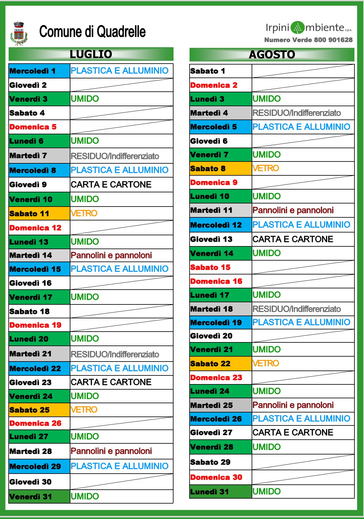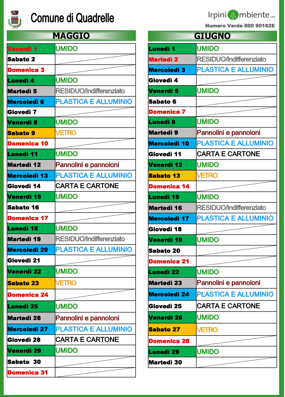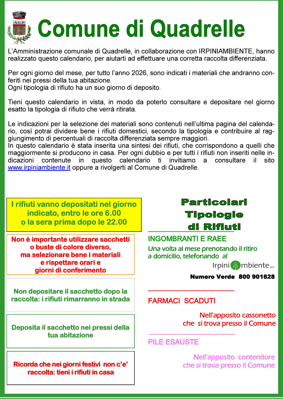 Il Comune di Quadrelle ha reso noto il calendario ufficiale della raccolta differenziata per l’anno 2026, realizzato in collaborazione con IrpiniAmbiente S.p.A., con l’obiettivo di agevolare i cittadini nel corretto conferimento dei rifiuti e migliorare ulteriormente le percentuali di raccolta differenziata sul territorio.