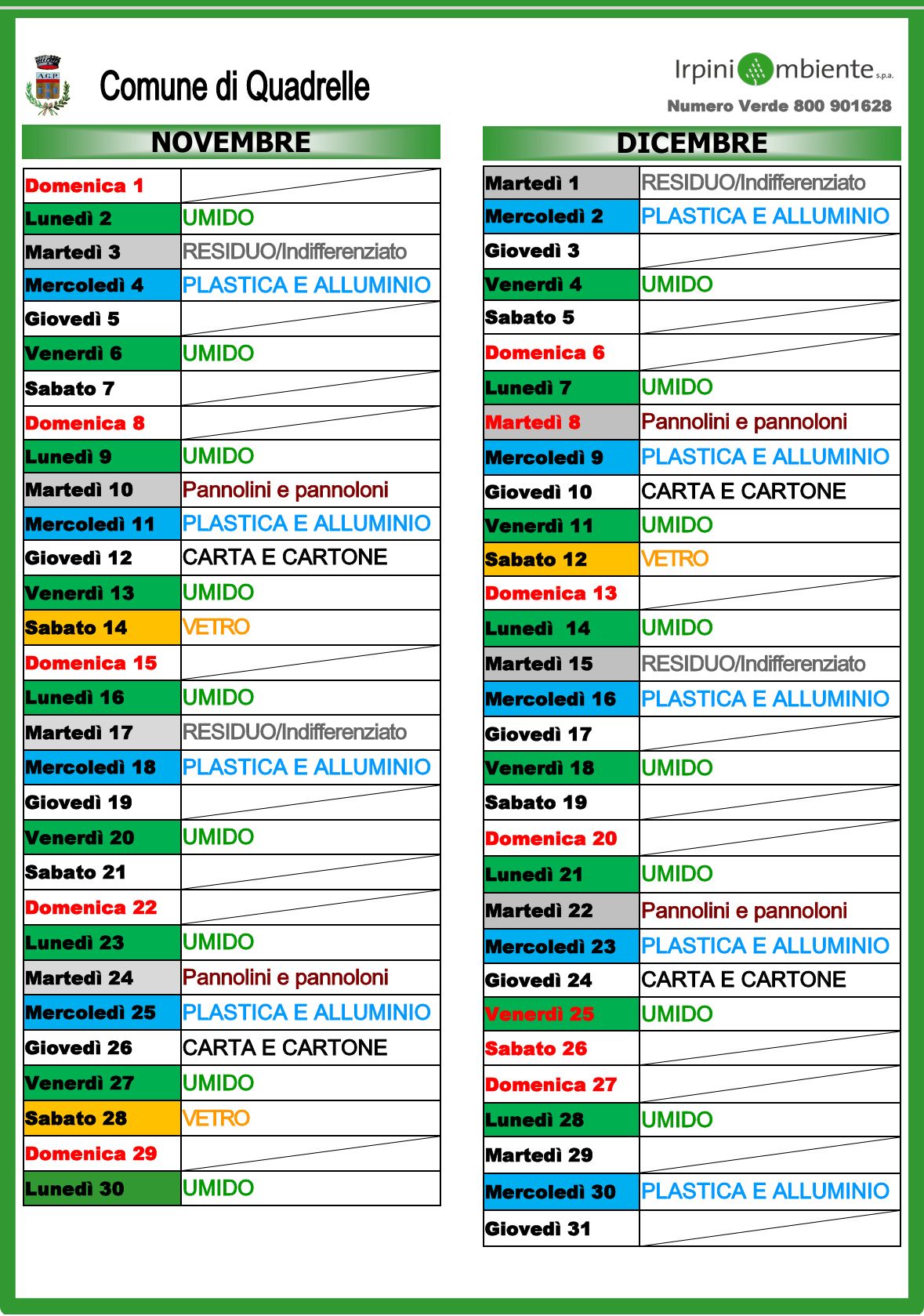 Quadrelle, pubblicato il calendario della raccolta differenziata 2026