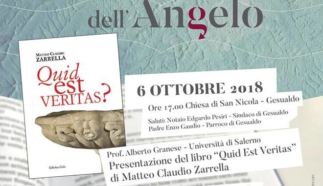 Sabato, 6 ottobre, alle 17.00, nella chiesa di San Nicola, a Gesualdo, ci sarà la presentazione del libro “Quid est veritas?” di Matteo Claudio Zarrella, già presidente del Tribunale di Lagonegro, per riflettere sul processo e sulla passione di Gesù. A seguire, il concerto dell’Orchestra del Liceo musicale di Gesualdo. È il quinto appuntamento del progetto artistico “Il volo dell’angelo”, ammesso a finanziamento dalla Regione Campania nell’ambito della linea strategica “Eventi per la promozione turistica e la valorizzazione dei territori”.