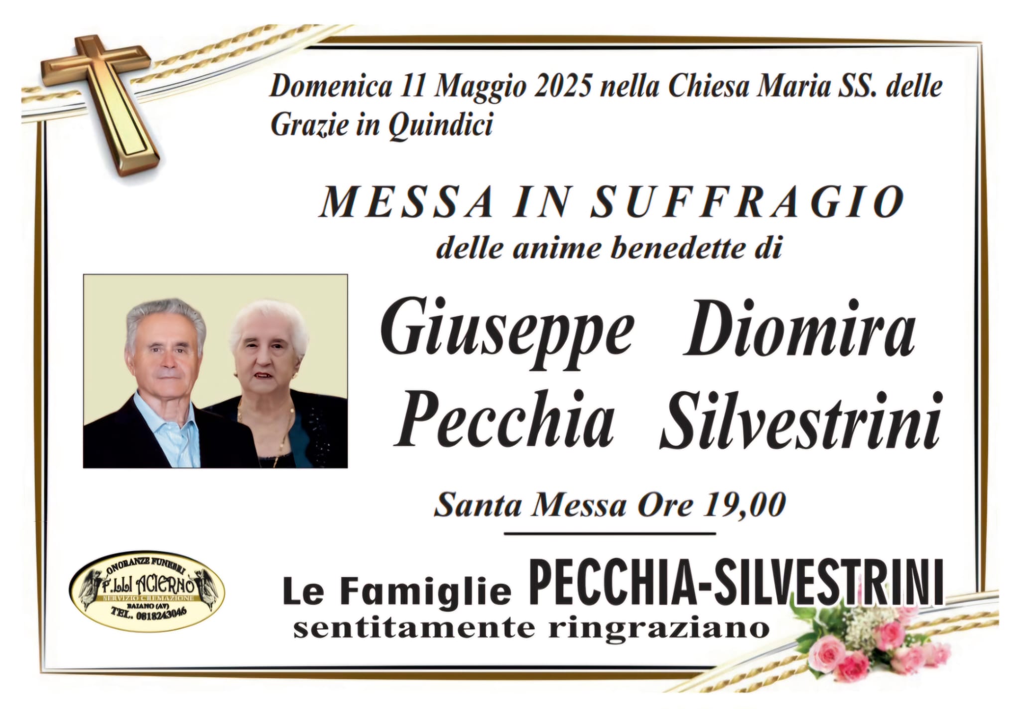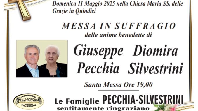 In un’atmosfera di raccoglimento e memoria, la comunità di Quindici si stringerà domenica 11 maggio attorno alle famiglie Pecchia e Silvestrini per la celebrazione della Messa in suffragio delle anime benedette di Giuseppe Pecchia e Diomira Silvestrini, presso la Chiesa Maria SS. delle Grazie, alle ore 19:00.