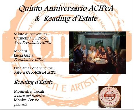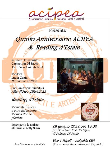 Domenica 26 giugno ore 18,00 presso il giardino dei sogni di Palazzo Di Paolo ad Atripalda, si festeggia il V Anniversario dell’associazione ACIPeA con la proclamazione dei vincitori Albo d’Oro ACIPeA 2022 e con un Reading d’Estate.