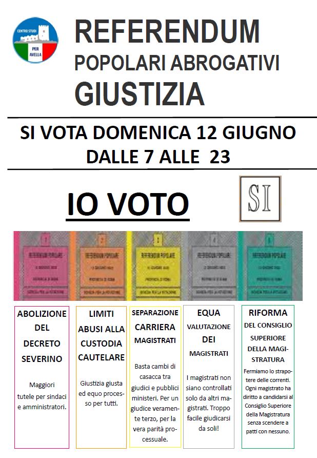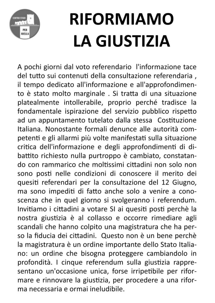 REFERENDUM. Centro Studi “Per Avella”: “Riformiamo la giustizia votando SI” 09/06/2022 binews.it ATTUALITA', AVELLA, EVIDENZA, POLITICA 0
