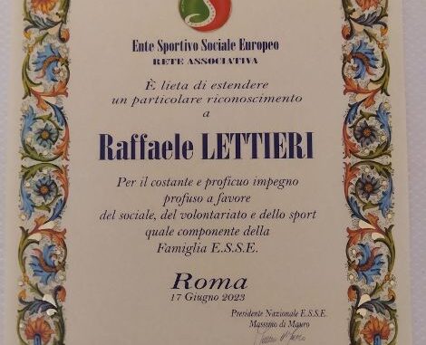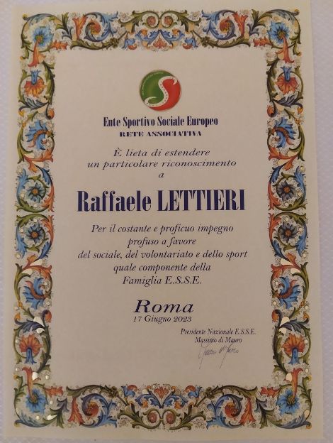 Riconoscimento per il maestro Raffaele Lettieri dall’ente Sportivo Sociale Europeo.