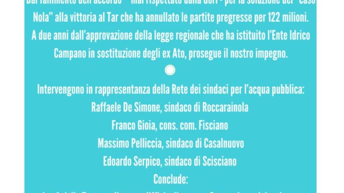 Intervengono, in rappresentanza della Rete dei sindaci per l’acqua pubblica, Raffaele De Simone, sindaco di Roccarainola e membro del comitato esecutivo dell’Ente Idrico Campano, insieme agli altri amministratori eletti nel consiglio di distretto Sarnese Vesuviano: Massimo Pelliccia, sindaco di Casalnuovo, Edoardo Serpico, sindaco di Scisciano, Franco Gioia, consigliere comunale di Fisciano.