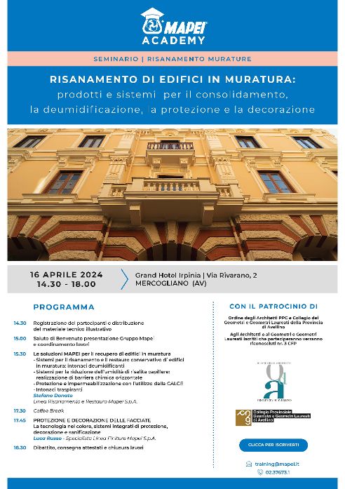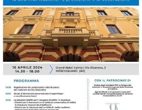 Mercogliano. Si terrà martedì 16 aprile alle ore 14.30 presso il Grand Hotel Irpinia, in via Rivarano, l’evento formativo “Risanamento di edifici in muratura: prodotti e sistemi per il consolidamento, la deumidificazione, la protezione e la decorazione” patrocinato dall’Ordine degli Architetti della provincia di Avellino in collaborazione con il Collegio dei Geometri e organizzato dal Gruppo Mapei. Interverranno gli specialisti Stefano Donato, che illustrerà le soluzioni Mapei per il restauro degli edifici in muratura e Luca Russo, sul tema: la tecnologia nel colore, sistemi integrativi di protezione, decorazione e sanificazione.