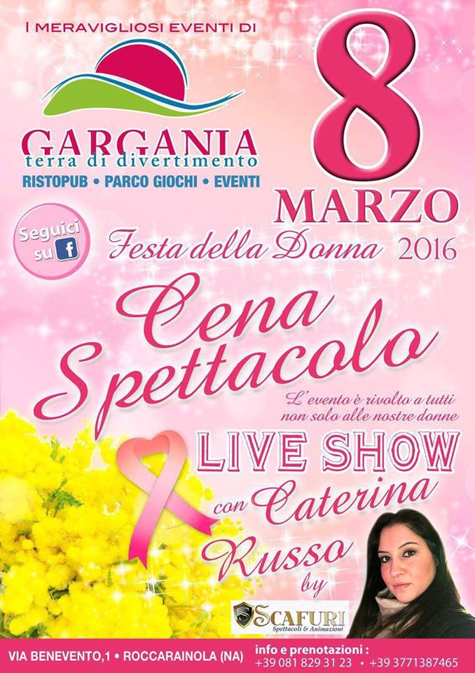 Cena spettacolo domani a Roccarainola presso il locale “Gargania” di via Benevento a Roccarainola, in occasione della Festa delle Donne si svolgerà una cena che sarà allietata dalla voce di Caterina Russo. Per informazione e prenotazioni potete chiamare al numero 0818293123.