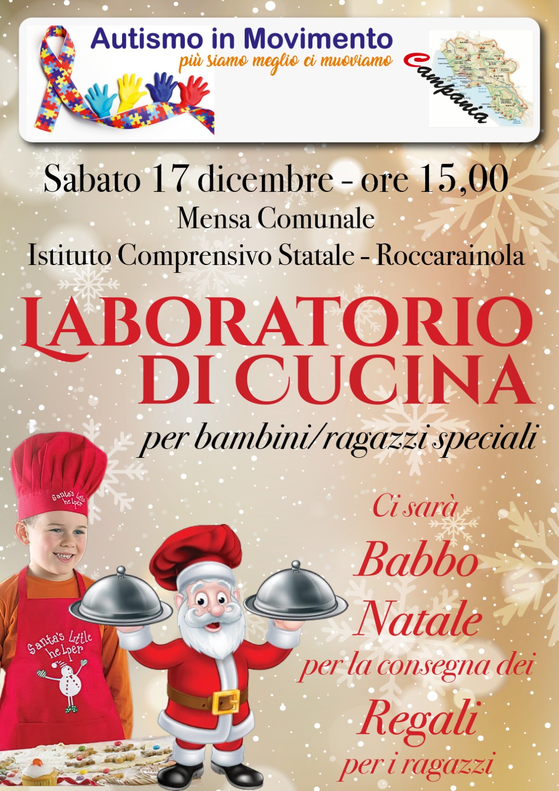 Nel pomeriggio di sabato 17 dicembre, alle ore 15, a Roccarainola (NA) presso l’Istituto Comprensivo Statale l’associazione “Autismo in Movimento” presenta il progetto dal titolo: Laboratorio di cucina. Grazie allo Chef Stefano Vacchiano i bambini e ragazzi speciali saranno i protagonisti del pomeriggio e si trasformeranno in veri e propri chef. Per l’occasione sarà presente anche Babbo Natale per la consegna di doni speciali.
