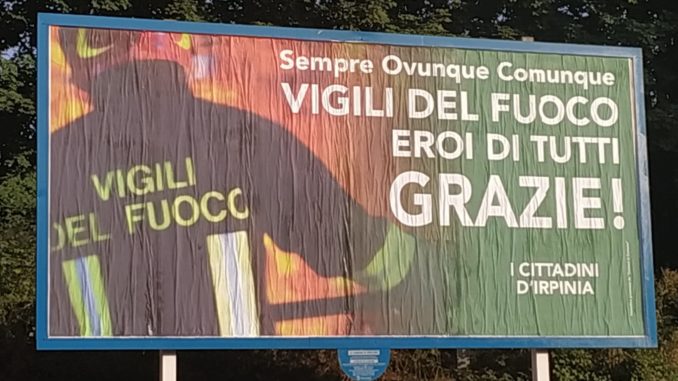 Gradita sorpresa questa mattina ad Avellino, e in alcuni comuni della provincia, sono comparsi manifesti di ringraziamento dedicati ai vigili del fuoco del comando provinciale irpino. Manifesti 6×3 per ringraziare il lavoro dei Vigili Del Fuoco impegnati per oltre 30 ore senza soste per spegnere l’incendio della fabbrica di Pianodardine andata in fiamme lo scorso venerdì.