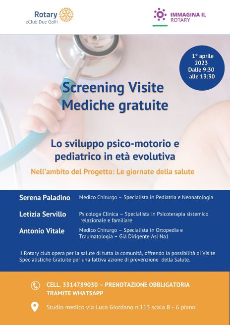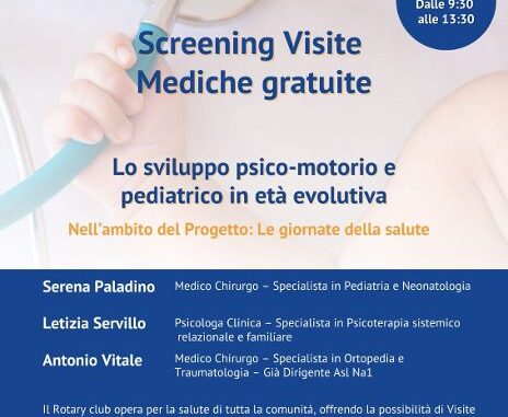 Il tema scelto per questa giornata è lo Sviluppo Psico-motorio e Pediatrico in età evolutiva, bambini, adolescenti e genitori al centro di questa giornata di prevenzione e promozione della salute, grazie all’attiva partecipazione di diversi specialisti coinvolti nel progetto di service: la Pediatra dr.ssa Serena Paladino, l’Ortopedico dr. Antonio Vitale e la Psicoterapeuta dr.ssa Letizia Servillo.