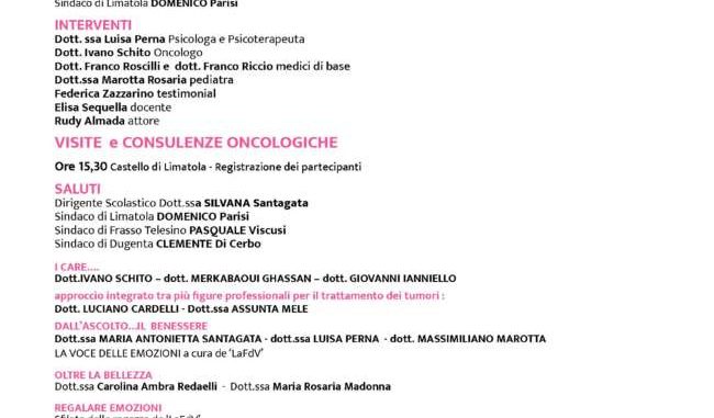Organizzato con il patrocinio dei comuni di LimatolaDugenta e Frasso Telesino (che ospitano le sedi dell’Istituto Comprensivo) – e con la collaborazione di Atelier Sposi FormichellaCoop. Tempi NuoviLa Mongolfiera e La Forza della Vita – il meeting vede la partecipazione di numerosi esperti del mondo dell’oncologia con interventi di alto valore scientifico dedicati ai diversi aspetti della prevenzione a cura dei dottori Luisa Perna, Ivano Schito, Franco Roscilli, Franco Riccio e Rosaria Marotta insieme alla testimonial Federica Zazzarino, alla docente Elisa Sequella ed all’attore Rudy Almada.