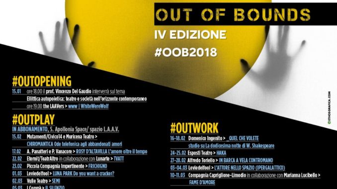 Si avvicina al termine la IV edizione della rassegna di teatro contemporaneo “Out of Bounds 2018”, in corso a Salerno fino al 15 Marzo 2018, ideata e diretta da L.A.A.V Officina Teatrale di Licia Amarante e Antonella Valitutti. Un primo bilancio positivo lo forniscono non solo il numero dei partecipanti agli spettacoli, laboratori e incontri con registi, attori e psicoterapeuti, ma anche il coinvolgimento di ragazzi e ragazze che hanno decretato il vero successo di questo appuntamento incentrato com’è su tematiche sociali che li coinvolgono direttamente. Out of Bounds dedica una giornata all’autrice Letizia Russo, ospite d’onore di questa edizione, il 12 marzo con l’ultimo incontro gratuito il 12 marzo che la accoglierà insieme a Renata Savo, critico teatrale, all’Archivio Architettura Contemporanea per un confronto dal titolo “Attenzione c’è Dio sulla collina. Primo Amore ed altri scritti” e con lo spettacolo “Primo Amore” allo Spazio L.A.A.V.. “Oblò”, invece, altro appuntamento imperdibile, si terrà il 13 Marzo al S. Apollonia Space.