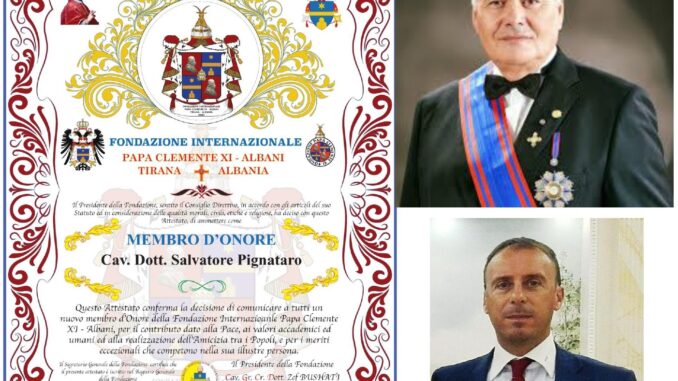 Con decreto del consiglio direttivo del 17 settembre, il Prof. Zef Bushati Cavaliere di Gran Croce, Diplomatico, già Ambasciatore presso la Santa Sede e Presidente della Fondazione Internazionale “Papa Clemente XI – Albani ha nominato l’irpino Salvatore Pignataro “Membro d’Onore” della prestigiosissima Fondazione. A comunicare è stato direttamente prof. Zef Bushati che ha voluto testimoniare il suo affetto al professionista irpino per i quali ha potuto apprezzare le sue qualità morali e professionali in coerenza con le finalità sociali, culturali e legate alla fratellanza tra i popoli in coerenza con lo statuto della Fondazione. Numerose sono le personalità italiane e internazionali che occupano ruolo di primo piano all’interno della Fondazione che ha come presidente onorario il Cardinale S.E. Ernest Simoni e il Presidente della Conferenza Episcopale albanese Mons. George Frendo Arcivescovo Metropolita di Tirana. Tra gli esponenti più importanti insigniti della Croce D’Oro della Fondazione figurano: S.E. Cardinale Pietro Parolin Cardinale di Stato Vaticano, S.E. Cardinale Agostino Vallini Vicario Generale di Sua Santità Papa Francesco e S.E. Rev.ma Cardinale Paul Poupard. Il dottore Salvatore Pignataro, Criminologo investigativo professionista, specialista in scienze forensi, sicurezza e intelligence, nonchè presidente regionale Associazione Criminologi per l’Investigazione e la Sicurezza della Campania, Componente dell’Accademia Italiana di Scienze Forensi e socio della Società Italiana di Intelligence nonché docente al Corso di formazione in Safety e Security presso l’Università degli Studi Giustino Fortunato.