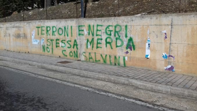 Apparse dal nulla scritte a sfondo esplicitamente razzista sui muri di Gesualdo (loc. Campo sportivo) e Frigento (loc. Piano della croce) a firma Noi con Salvini.