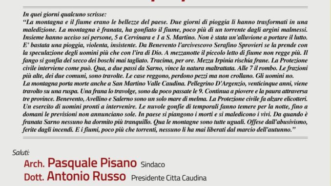 “La montagna e il fiume erano le bellezze del paese. Due giorni di pioggia li hanno trasformati in una maledizione…”, alcune parole che furono scritte venti anni fa poco dopo, il consumarsi di una tragedia che ha visto coinvolte tre province: Avellino, Salerno e Benevento. Un paesaggio irpino bellissimo è diventato protagonista di un momento drammatico fatto di crolli, morte e fango. “Ricordare per prevenire” è il tema del convegno volto a non dimenticare ciò che è accaduto e ricordare le vittime di quel giorno.