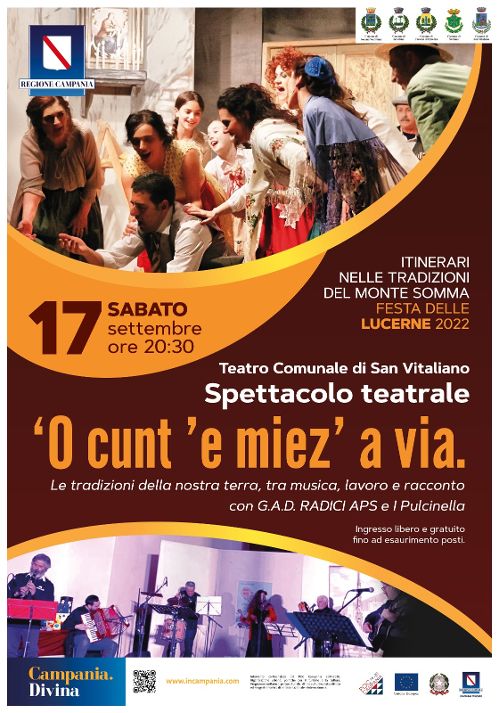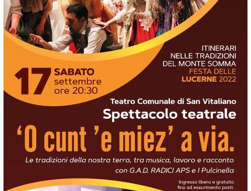 Dopo il successo, di pubblico e mediatico, dell’edizione 2022 della Festa delle Lucerne di Somma Vesuviana, tenutasi, come da tradizione, ad inizio agosto presso il Borgo del Casamale, antico agglomerato urbano del comune vesuviano, il progetto “Itinerari nelle tradizioni del Monte Somma – Festa delle Lucerne 2022” prosegue il suo cammino presso i comuni partner dell’iniziativa. Tra settembre e ottobre 2022, i comuni di Scisciano, Castello di Cisterna, Saviano e San Vitaliano, che insieme, per l’appunto, al Comune di Somma Vesuviana (capofila), promuovono il su menzionato progetto, beneficiario di un cofinanziamento nell’ambito del POC Campania 2014-2020 – Rigenerazione Urbana, politiche per il turismo e la cultura. Programma unitario di percorsi turistici di tipo culturale, naturalistico ed enogastronomico di portata nazionale e internazionale, ospiteranno alcuni eventi dedicati alla tradizione teatrale locale. Si comincia il 17 settembre, presso il Teatro Comunale di San Vitaliano, con la messa in scena dello spettacolo teatrale “‘O cunt ‘e miez’ a via – Le tradizioni della nostra terra, tra musica, lavoro e racconto”, con il G.A.D. RADICI APS e I Pulcinella. Un percorso artistico che rievoca la vita dei cortili, le voci che si sentivano in strada, uscire dalle case, dai vicoli, dalle botteghe. Una sequenza di aneddoti e fatti di vita che portano in scena personaggi pittoreschi e popolari, dai mille colori sia nelle vesti, sia nelle parole. Storie che oggi difficilmente si possono ritrovare nel quotidiano, perché alcuni mestieri non esistono più, perché alcune parole sono in disuso e perché è cambiato il modo di rapportarsi tra le persone. Si prosegue con un doppio appuntamento, giovedì 22 settembre presso l’Anfiteatro Parco Enrico De Nicola di Castello di Cisterna con Maurizio Casagrande in “A tu per tre”, e venerdì 23 settembre a Saviano, presso il Cortile di Palazzo Allocca, con la messa in scena de “I Menecmi” a cura Compagnia Teatrale Fuitevenne. Si conclude, l’8 settembre, di nuovo con Maurizio Casagrande questa volta di scena presso il Teatro Comunale di Scisciano. Quattro spettacoli che concludono, dunque, il lungo percorso di promozione turistica e valorizzazione territoriale, attraverso le tradizioni dei comuni posti all’ombra del Monte Somma, cominciato proprio con l’evento più rappresentativo dell’area: La Festa delle Lucerne.