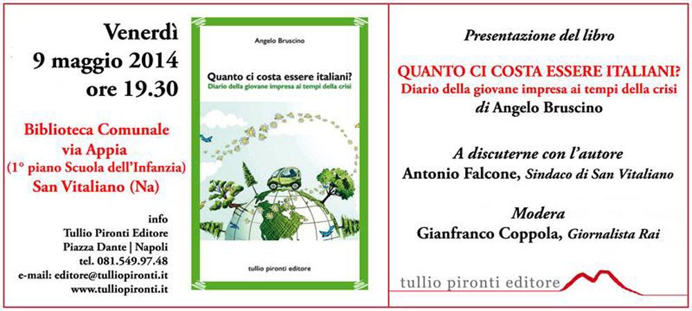 SAN VITALIANO. Venerdi 9 maggio presentazione del libro “Quanto ci costa essere Italiani?” 05/05/2014 binews.it ATTUALITA', CULTURA e MANIFESTAZIONI, NOLANO 0 Sarà presentato venerdì 9 maggio alle ore 19,30 presso la biblioteca comunale di San Vitaliano il libro di Angelo Bruscino dal titolo: “Quanto ci costa essere italiani? Diario della giovane impresa ai tempi della crisi”.