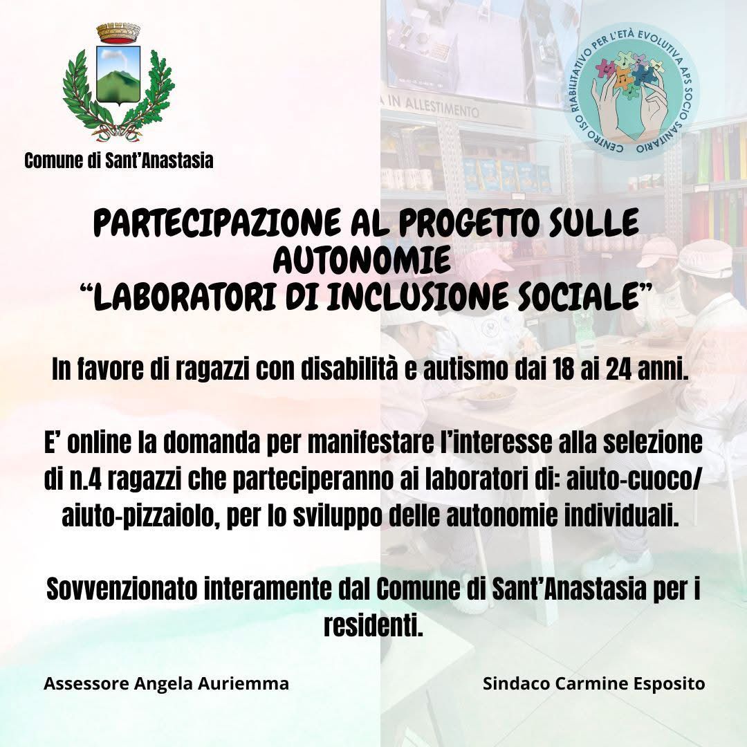 Il Comune di Sant’Anastasia ha pubblicato un avviso pubblico finalizzato all’individuazione di giovani da coinvolgere in progetti di inclusione sociale dedicati a ragazzi con disabilità e disturbi dello spettro autistico.