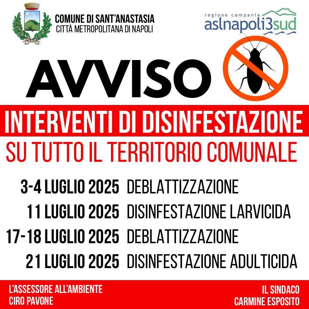 Il Comune di Sant’Anastasia, in sinergia con l’ASL Napoli 3 Sud e la Regione Campania, ha predisposto un piano dettagliato di disinfestazione per tutto il territorio comunale, con l’obiettivo di garantire igiene, sicurezza e benessere alla cittadinanza durante il periodo estivo.