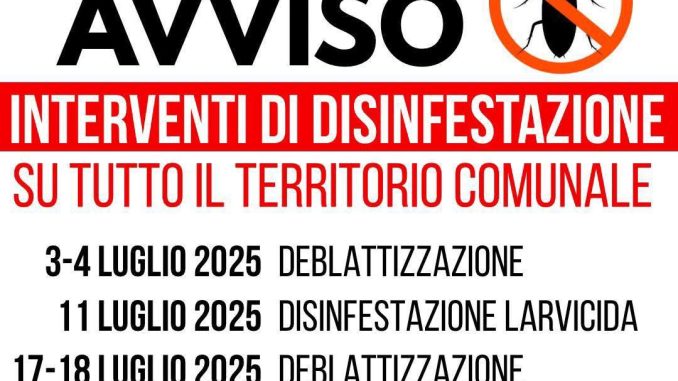 Si tratta di un’azione importante per prevenire la proliferazione di insetti e parassiti, soprattutto in vista delle alte temperature estive. L’amministrazione invita i cittadini a collaborare adottando semplici precauzioni: evitare l’esposizione di alimenti, biancheria e animali all’esterno durante gli interventi, e mantenere porte e finestre chiuse nelle ore indicate.