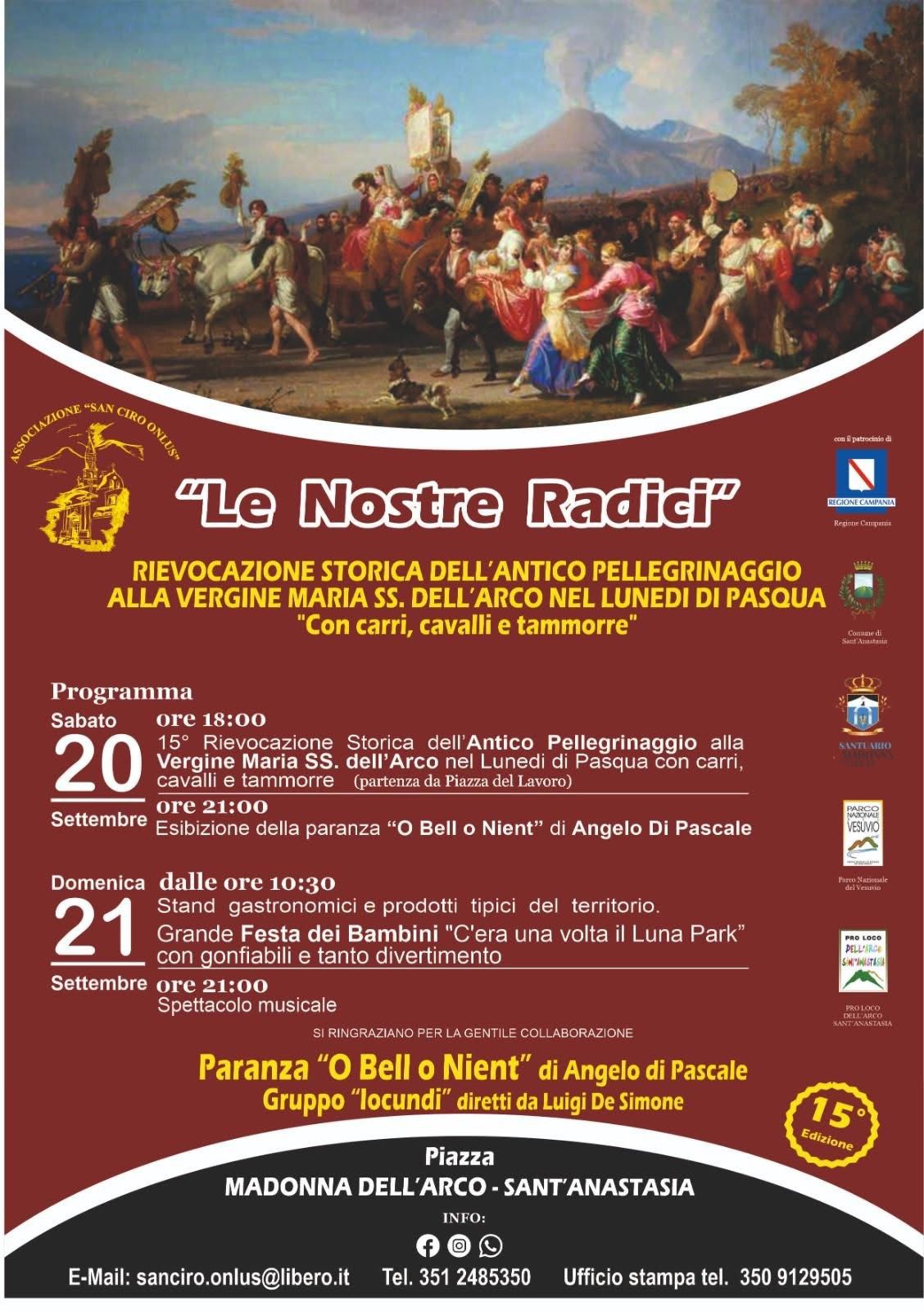 SANT’ANASTASIA (Napoli) – Torna uno degli appuntamenti più attesi della cultura popolare campana. L’associazione San Ciro Onlus organizza il 20 e 21 settembre la XV edizione di “Le Nostre Radici”, la rievocazione storica dell’antico pellegrinaggio alla Vergine Maria Santissima dell’Arco nel Lunedì di Pasqua. Un evento che, tra fede, folklore e memoria collettiva, richiama ogni anno centinaia di cittadini e visitatori.