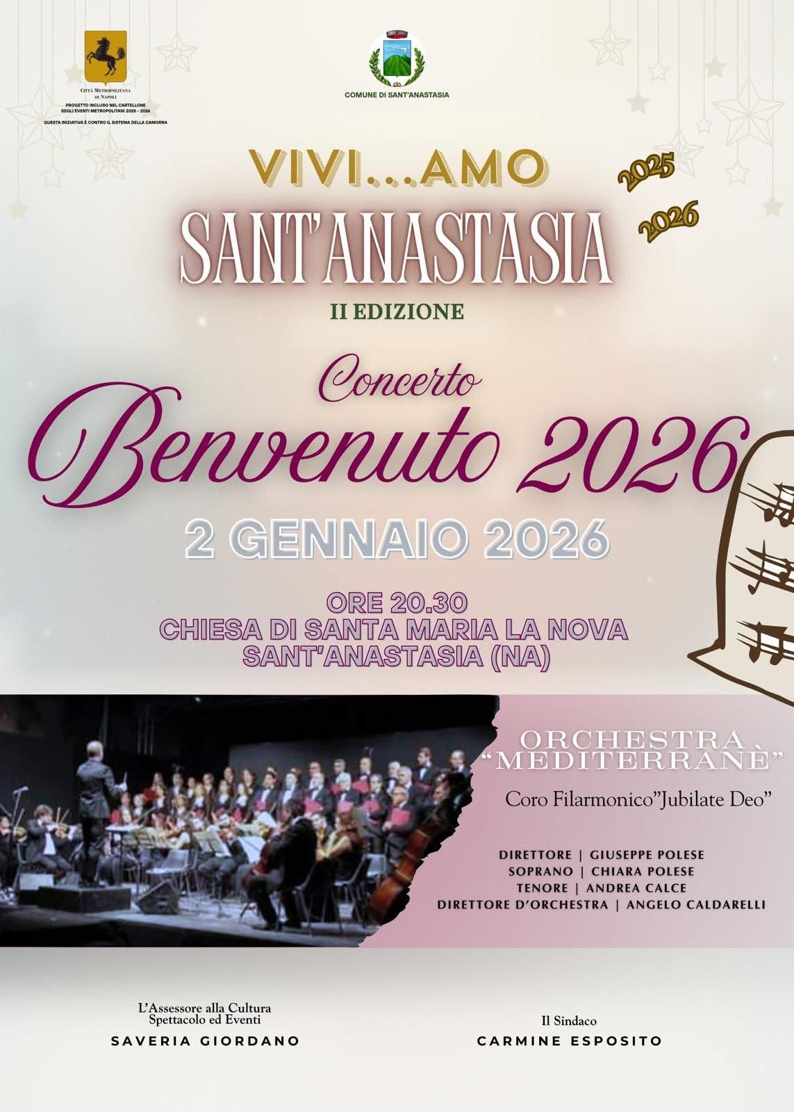 Sarà la musica, questa sera, a dare ufficialmente il benvenuto al nuovo anno a Sant’Anastasia. Alle ore 20.30, nella chiesa di Santa Maria La Nova, è in programma il Concerto di Benvenuto al 2026, appuntamento inserito nel cartellone degli eventi promossi dalla Città Metropolitana e sostenuto dall’amministrazione comunale.