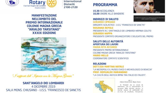 Sant’Angelo dei Lombardi (AV): il Rotary club Sant’Angelo dei Lombardi – hirpinia goleto presenta la XXXIX edizione del premio internazionale Colonie Magna Grecia “Arialdo Tarsitano”