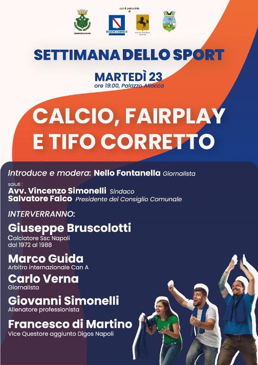 Oltre al convegno sul calcio e tifo corretto, Venerdì 26 si terrà il convegno su sport e alimentazione mentre sabato è prevista la festa di chiusura all’interno del villaggio dello sport allestito nel parcheggio comunale con la partecipazione di tutte le associazioni sportive del territorio. Alla festa partecipa la Questura di Napoli con le specialità Cinofili, Scientifica, Stradale e Fiamme Oro.