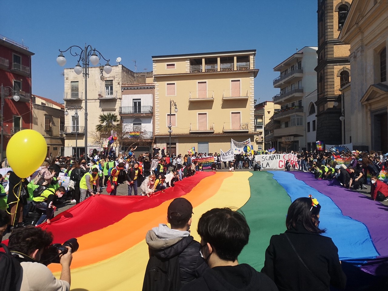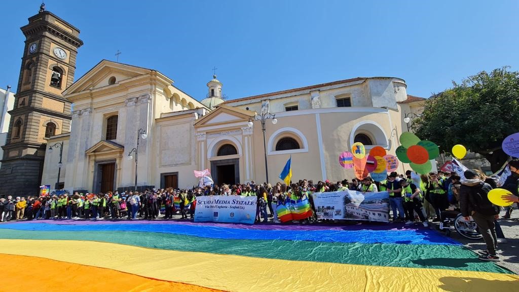 “Una giornata straordinaria – ha aggiunto l’Assessore alla Pubblica istruzione, Daniela Ugliano – un crescendo di emozioni. Uno scenario bellissimo. Le bandierine che sventolavano, i cori, gli striscioni, l’entusiasmo di tanti studenti raccolti in un unico grande cordone umano che ha attraversato la città nel segno della pace, della coralità, della solidarietà”.