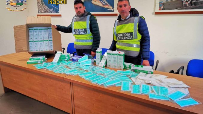 Le fiamme gialle hanno scoperto che in una parafarmacia in località Varcaturo di Giugliano venivano vendute due tipologie di mascherine rispettivamente con rincari del 6150% per quelle “LifeGuard” e 300% per le “monovelo”.