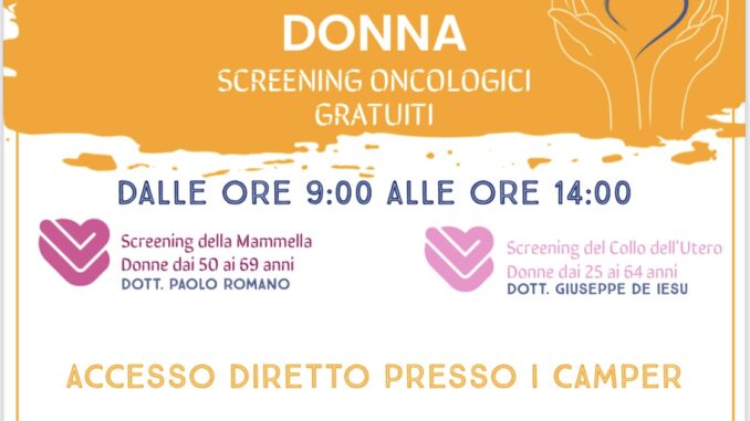 Dalle ore 9.00 alle ore 14.00 sarà possibile aderire, senza prenotazione con accesso diretto ai Camper dell’ASL, allo screening gratuito della mammella per le donne dai 50 ai 69 anni (referente dott. Paolo Romano) e del collo dell’utero per le donne dai 25 ai 64 anni (referente dott. Giuseppe De Iesu).