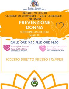 Dalle ore 9.00 alle ore 14.00 sarà possibile aderire, senza prenotazione con accesso diretto ai Camper dell’ASL, allo screening gratuito della mammella per le donne dai 50 ai 69 anni (referente dott. Paolo Romano) e del collo dell’utero per le donne dai 25 ai 64 anni (referente dott. Giuseppe De Iesu).