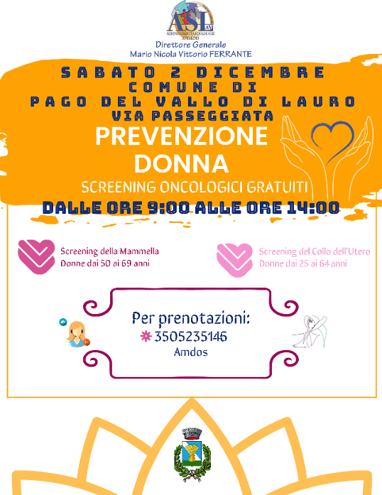 Sabato 2 dicembre le unità mobili dell’ASL dalle ore 9.00 alle ore 14.00 faranno tappa nel Comune di Pago del Vallo di Lauro in Via Passeggiata. Per prenotazioni tel. 3505235146 (Amdos Forino)