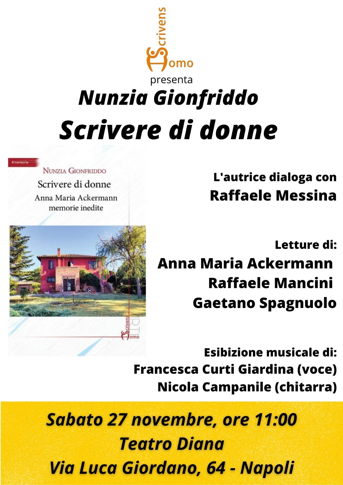 Si presenta sabato 27 novembre 2021 alle ore 11 al Teatro Diana in via Luca Giordano 64 Napoli, “Scrivere di donne – Anna Maria Ackermann memorie inedite” di Nunzia Gionfriddo, edizioni Homo Scrivens. L’autrice ne parla con Raffaele Messina, tra le letture di Anna Maria Ackermann, Raffaele Mancini, Gaetano Spagnuolo. Esibizione musicale di Francesca Curti Giardina (voce) e di Nicola Campanile (chitarra).
